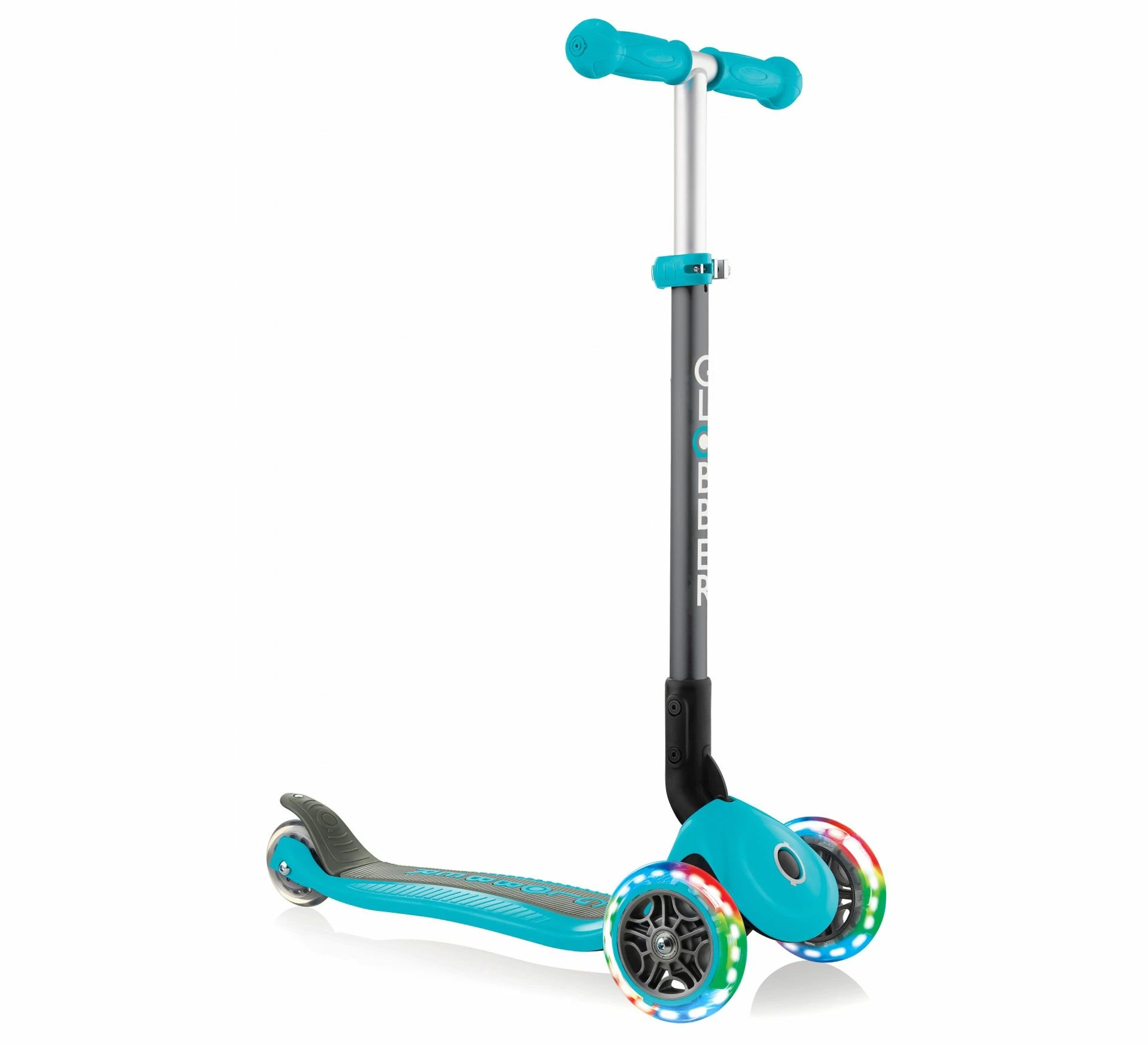Der einklappbare Globber Primo Lights Tri-Scooter für Kinder ist ein robuster Dreiradroller aus Stahl mit Kunststoff und ausgestattet mit einem höhenverstellbaren, klappbaren Lenker und Rädern mit Lichtern.