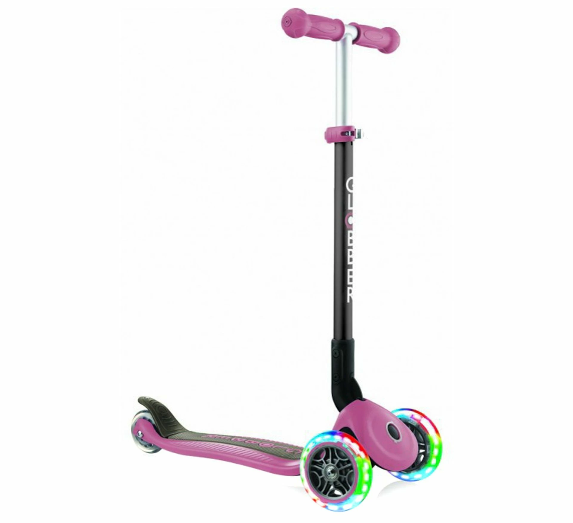 Der einklappbare Globber Primo Lights Tri-Scooter für Kinder ist ein robuster Dreiradroller aus Stahl mit Kunststoff und ausgestattet mit einem höhenverstellbaren, klappbaren Lenker und Rädern mit Lichtern.