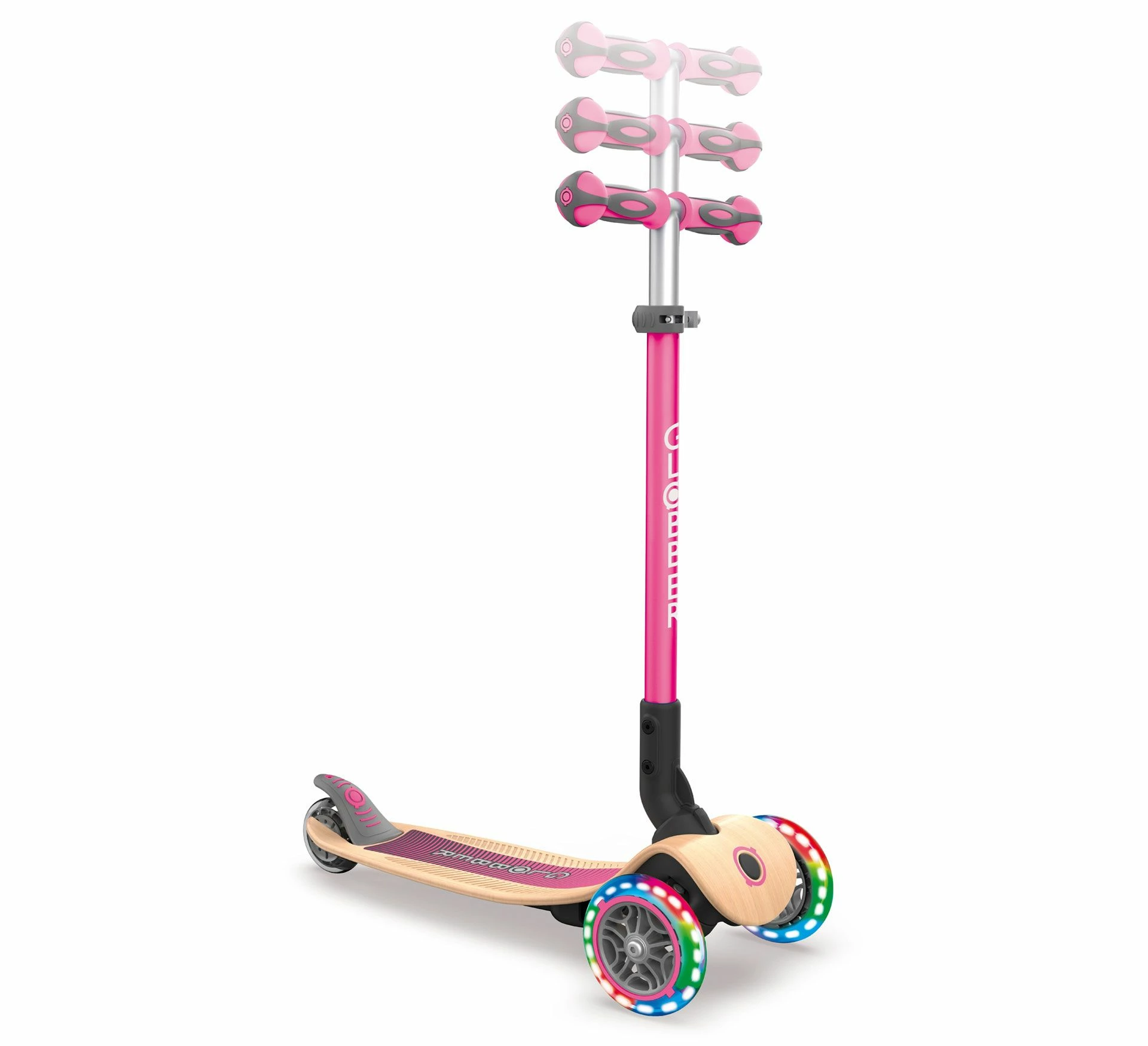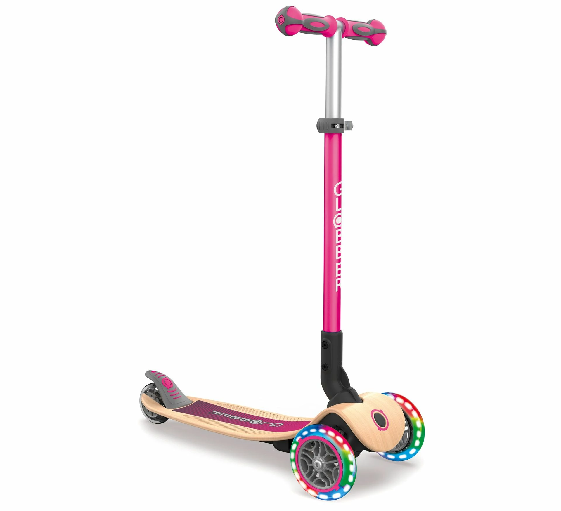 Der einklappbare Globber Primo Lights Wood Tri-Scooter für Kinder ist ein robuster Dreiradroller aus Stahl mit Kunststoff und ausgestattet mit einem höhenverstellbaren, klappbaren Lenker und Rädern mit Lichtern.