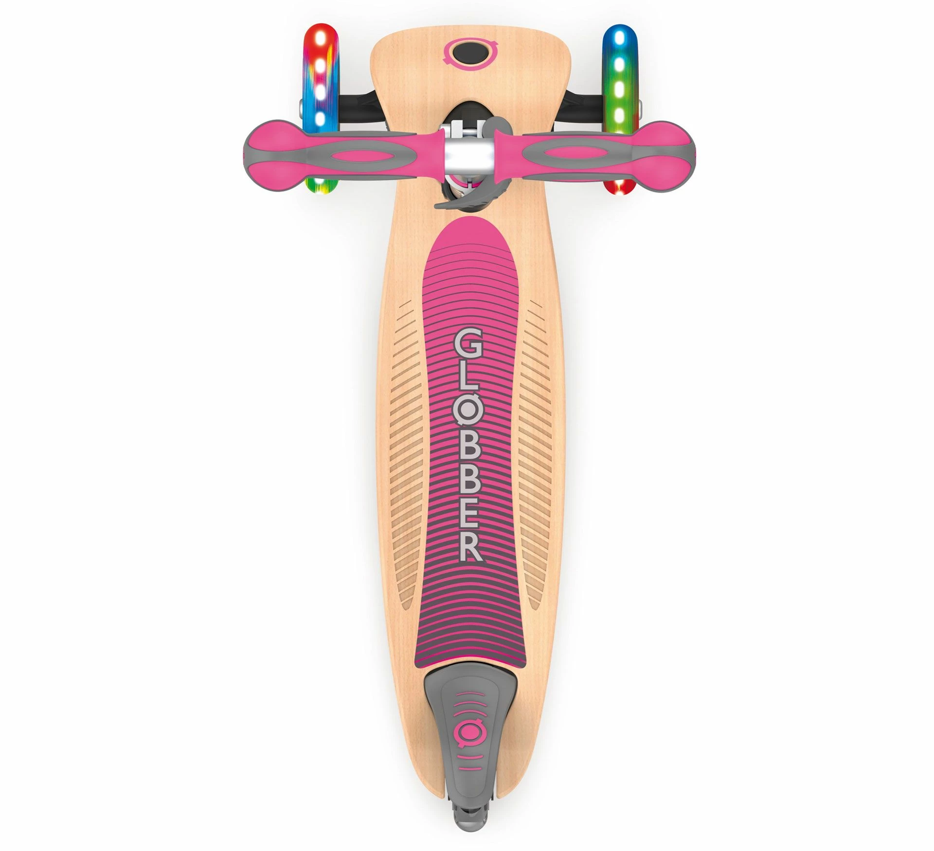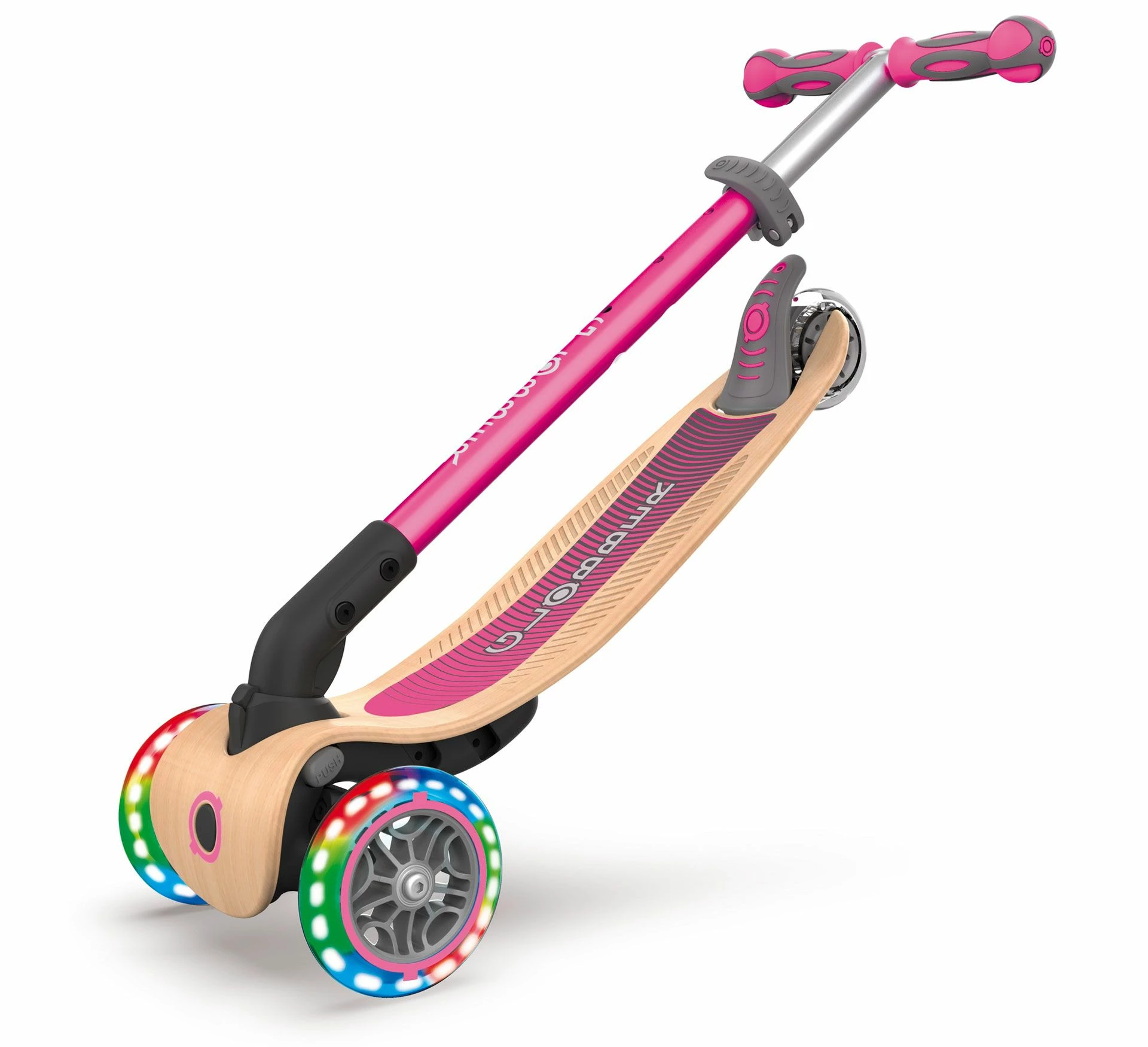Der einklappbare Globber Primo Lights Wood Tri-Scooter für Kinder hat folgende Eigenschaften: