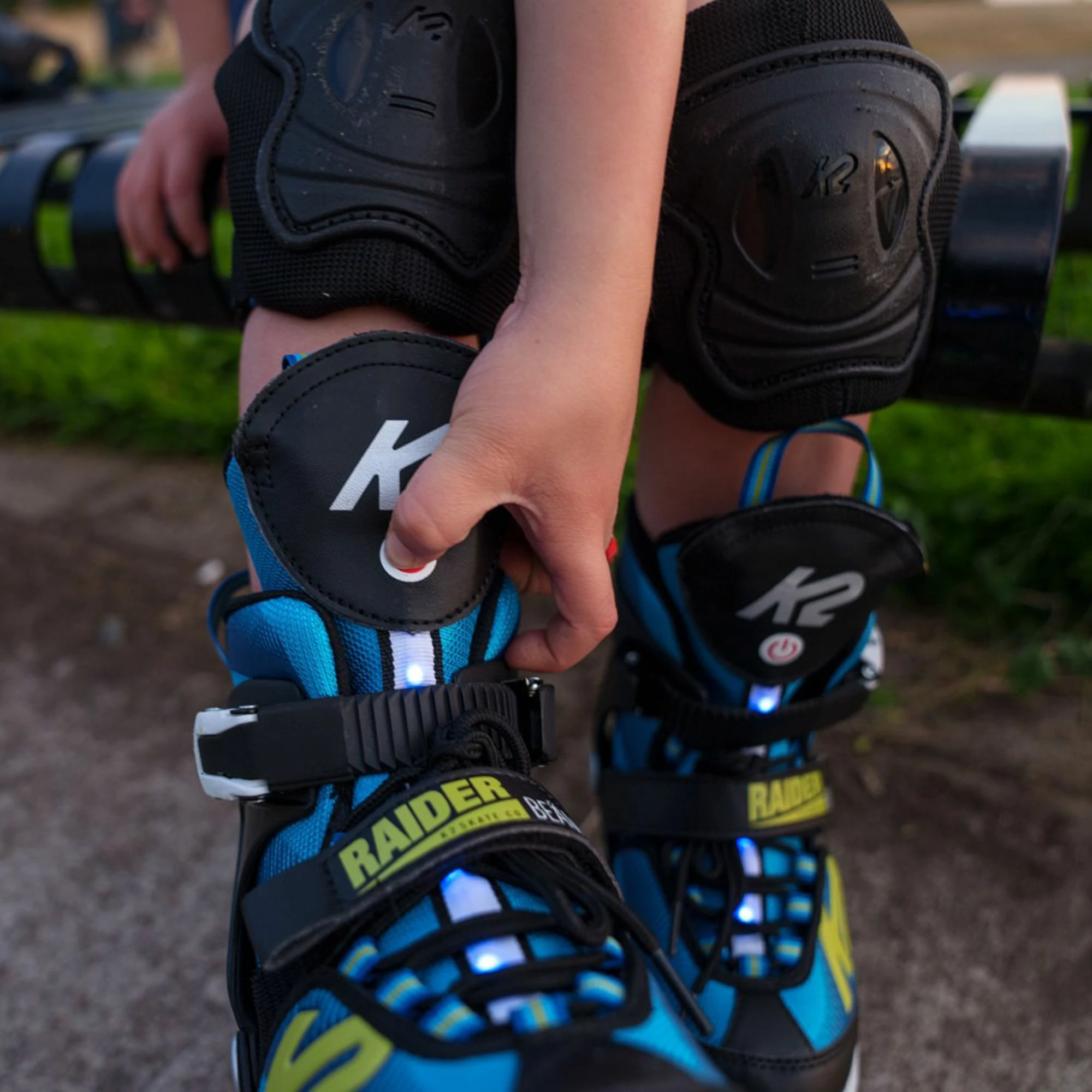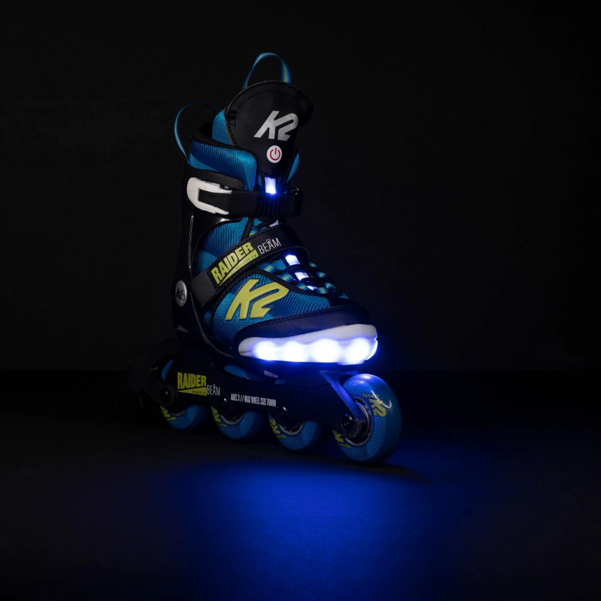 Die K2 Raider Beam Skates für Kinder eignen sich wunderbar zum Skaten in der Freizeit. Die Skates sind vorne mit kleinen LED-Leuchten versehen.
